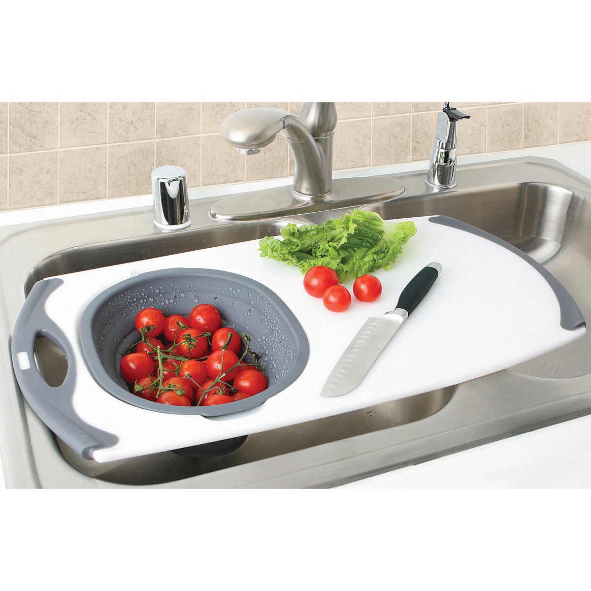 This cutting board increases work space, by fitting over a sink, and has a built in, collapsible strainer, making it easy to rinse fruits and veggies as you go.